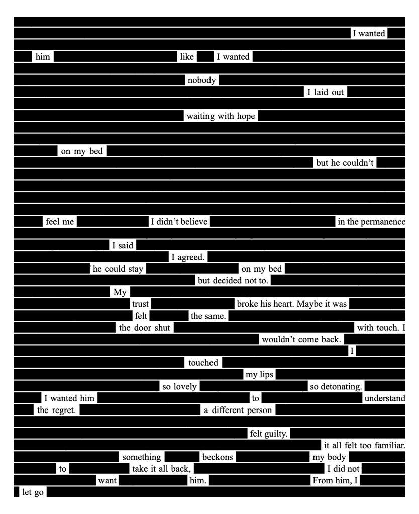 I feared that something about me beckoned boys to hurt me for my body. Was he a different person because of me? If not, why did he sound so unlike himself and so much like every other guilty boy? I kicked him out because it felt too familiar.